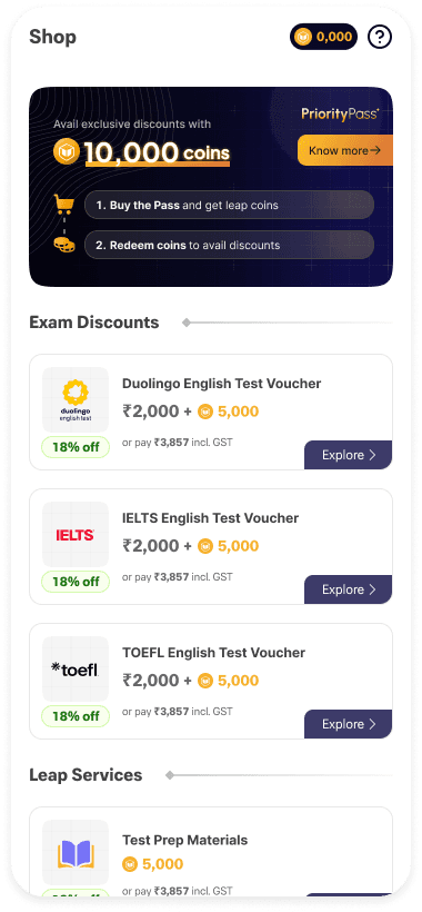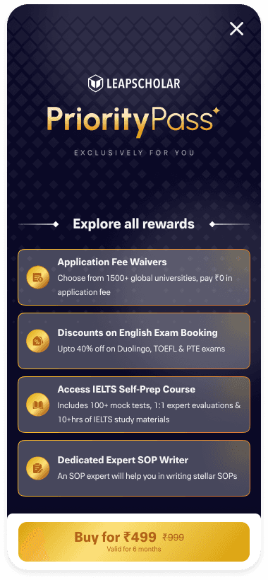 Priority Pass is a prepaid wallet-based premium offering for study-abroad aspirants. Users pay once and unlock high-value benefits like discounts and cashback on test bookings, application fees, and deposits. It boosts user commitment by offering flexibility, tangible savings, and a reason to choose Leap Scholar over competitors.